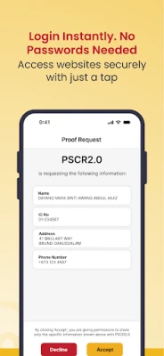 Bem-vindo ao BruneiID, a sua identidade digital oficial para o Brunei Darussalam, gerida com total segurança no seu smartphone. Desenvolvido com tecnologia avançada de blockchain e inteligência artificial, BruneiID oferece uma forma robusta e verificável de administrar a sua identidade online. Com ele, a verificação de identidade torna-se fluida e o acesso a um leque crescente de serviços digitais, tanto governamentais quanto privados, é simplificado. A missão primordial do BruneiID é proporcionar uma identidade digital única e fidedigna para todos os residentes elegíveis, otimizando o acesso online, reforçando as medidas de segurança e garantindo que o controlo das suas informações pessoais permaneça firmemente nas suas mãos.